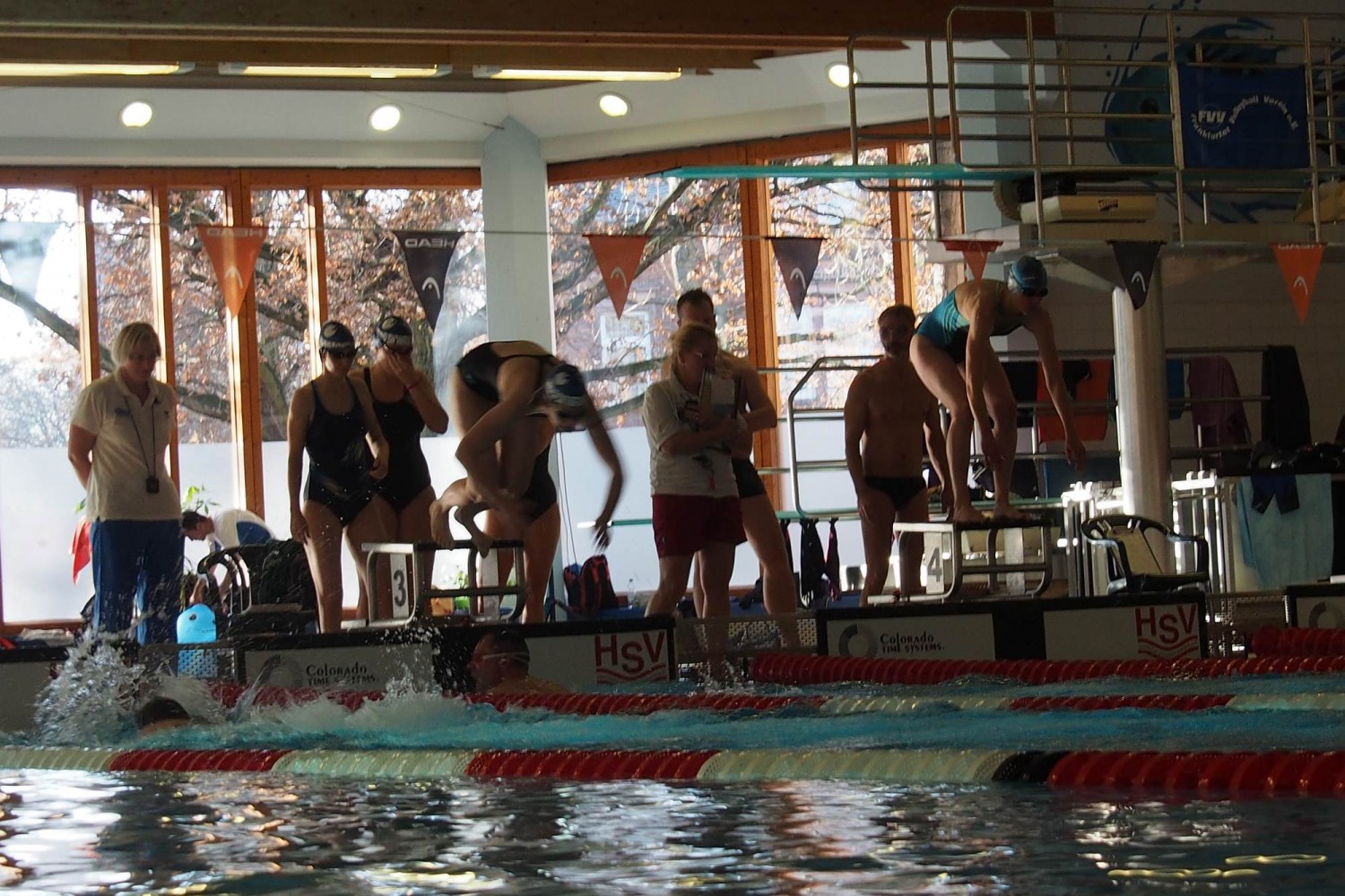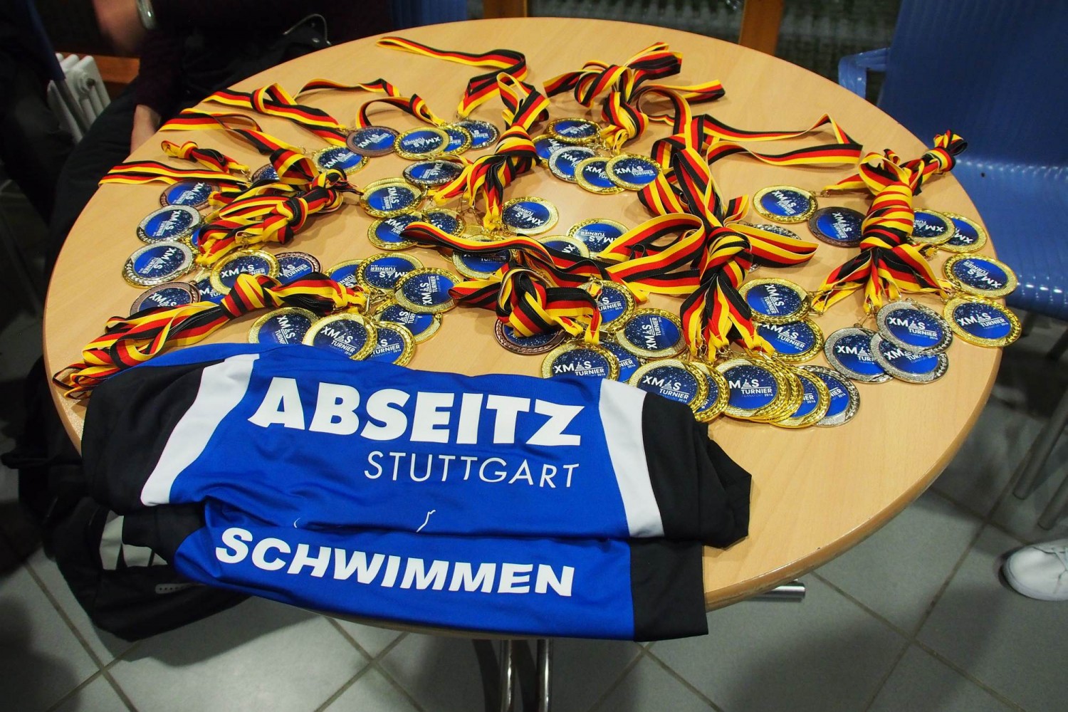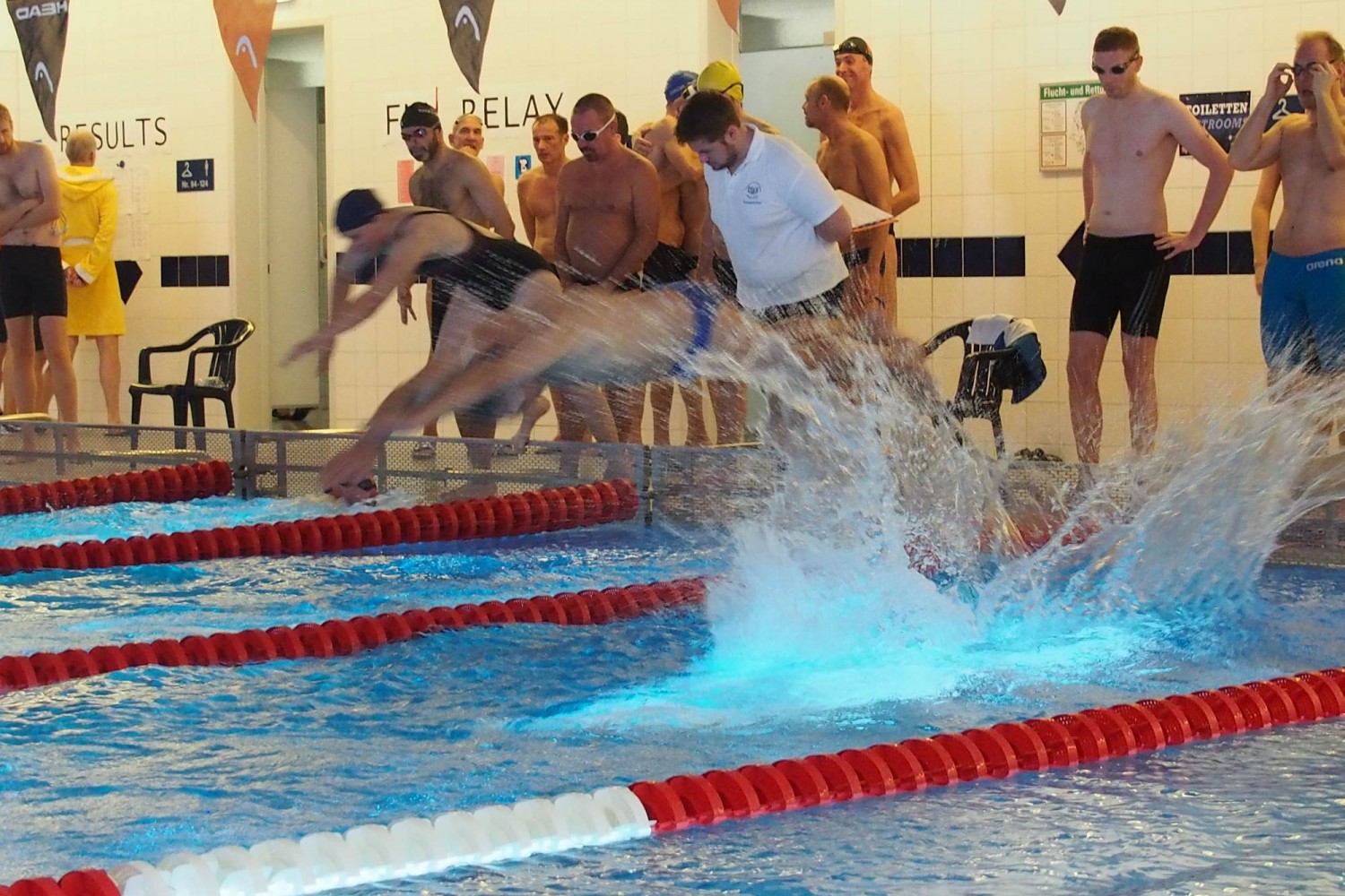 Oder 17? Ich schaue noch einmal auf den Zettel, nein, es ist die 16. Jetzt bitte keine Nervosität, das war doch alles gut organisiert, nicht wahr? Eigentlich bin ich aber noch ziemlich geschafft von den 100 Metern Delphin und den 200 Metern Lagen, das ist gerade mal 10 Minuten her. Wie kann man nur so blöd sein, sich für so viele Starts melden? Egal, ich gebe mein bestes, schließlich ist’s ja für den Verein und für alle, die hier für Stuttgart schwimmen. Auf der anderen Seite: die Muskeln spüren sich so fade an und ich bin noch ganz außer Atem. Aber auf der Nebenbahn, da sind die Düsseldorfer, denen wollen wir‘s doch zeigen! Außerdem: nachher gibt’s leckeres Essen beim Italiener und dann gibt’s ja noch die Party heute Abend in der Union Halle. Wenn wir da so tanzen, wie wir jetzt schwimmen, na dann wird das richtig gut. Klar, wir sind dieses Jahr ja auch mit 18 Leuten auf dem XMas-Turnier in Frankfurt und natürlich mächtig stolz, dass wir mit unseren fünf Frauen nicht nur viele Mixed-Staffeln, sondern nach vielen, vielen Jahren auch mal wieder Frauen-Staffeln schwimmen können. Die haben es eh‘ viel schwerer als wir Jungs, die müssen bei den Staffeln richtig oft ran.