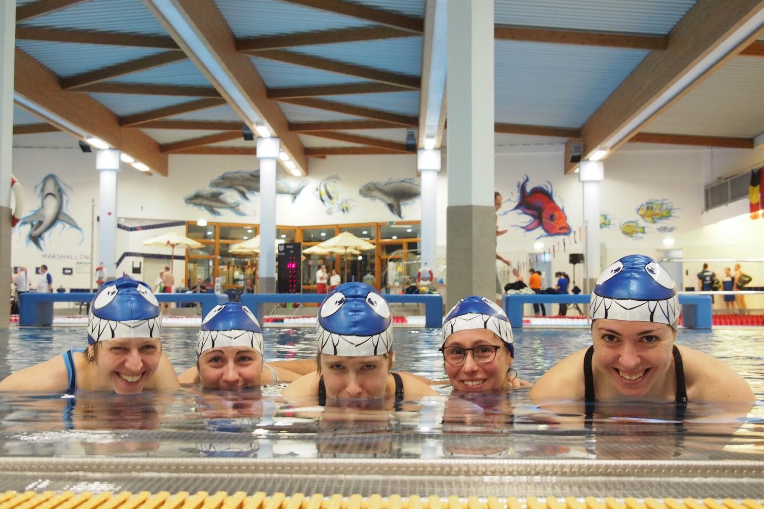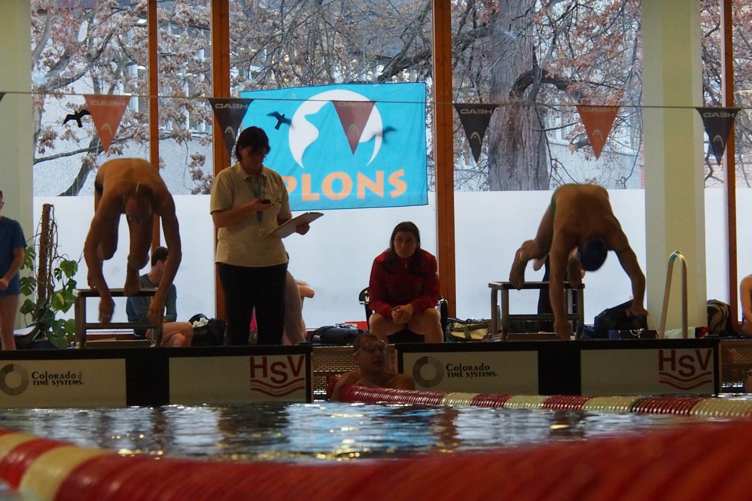 Unsere drei Wettkampfneulinge Oda, Carina und Moritz sind voll dabei und machen ihre Sache richtig gut, tja, bei den Staffeln gibt es eben keinen Anfängerbonus. Thomas hat 18 (ja, achtzehn!) Staffeln für uns ausgeklügelt und seine Berechnungen werden voll aufgehen. Denn beim Abendessen im Restaurant werden wir uns nachher über unsere sieben Gold- und vier Silbermedaillen für die Staffeln freuen. Von den ganzen Medaillen für die Einzelstarts mal ganz zu schweigen. Aber jetzt heißt es erst mal mit Schwächegefühlen das Becken verlassen. Sehr gut, da stehen schon Dagmar und Andreas bereit, die beiden lächeln mich etwas gequält an, haben also auch schon ein hartes Pensum hinter sich gebracht. Und Sandra ist noch im Wasser, sie ist die Vierte in unserem Bund und wird auch gleich noch aus dem Pool rauskommen. Und dann wieder hinten anstellen, aber bitteschön sofort! Es geht schon los, der Schiedsrichter gibt das Zeichen für den Start. Ich habe wenigstens noch die beiden anderen vor mir, also noch eine Minute zum Durchatmen. Diese Minute geht aber echt schnell vorbei, Sandra ist mittlerweile auch schon da, gut zu wissen, dass wir komplett sind. Dagmar hat gerade die 25-Meter-Wende hinter sich und schwimmt nun kraftvoll die Bahn zurück. Ich steige auf den Startblock, nehme meine Position ein und spanne die Muskulatur an. Noch einmal 50 Meter lang ALLES geben…