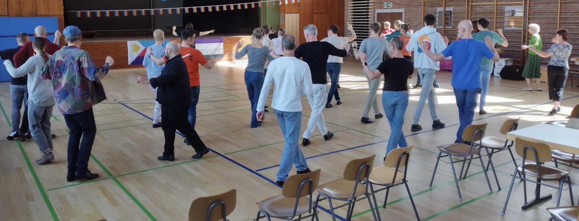 We dance Tango Argentino without fixed roles: leading, following or switching – whether alone or in pairs, everyone is welcome! Our goal is to consciously break down traditional gender roles and make gender diversity tangible through dance. In four workshops, we will teach basic and advanced techniques and steps before giving free rein to our desire to dance at our milonga until late into the night.