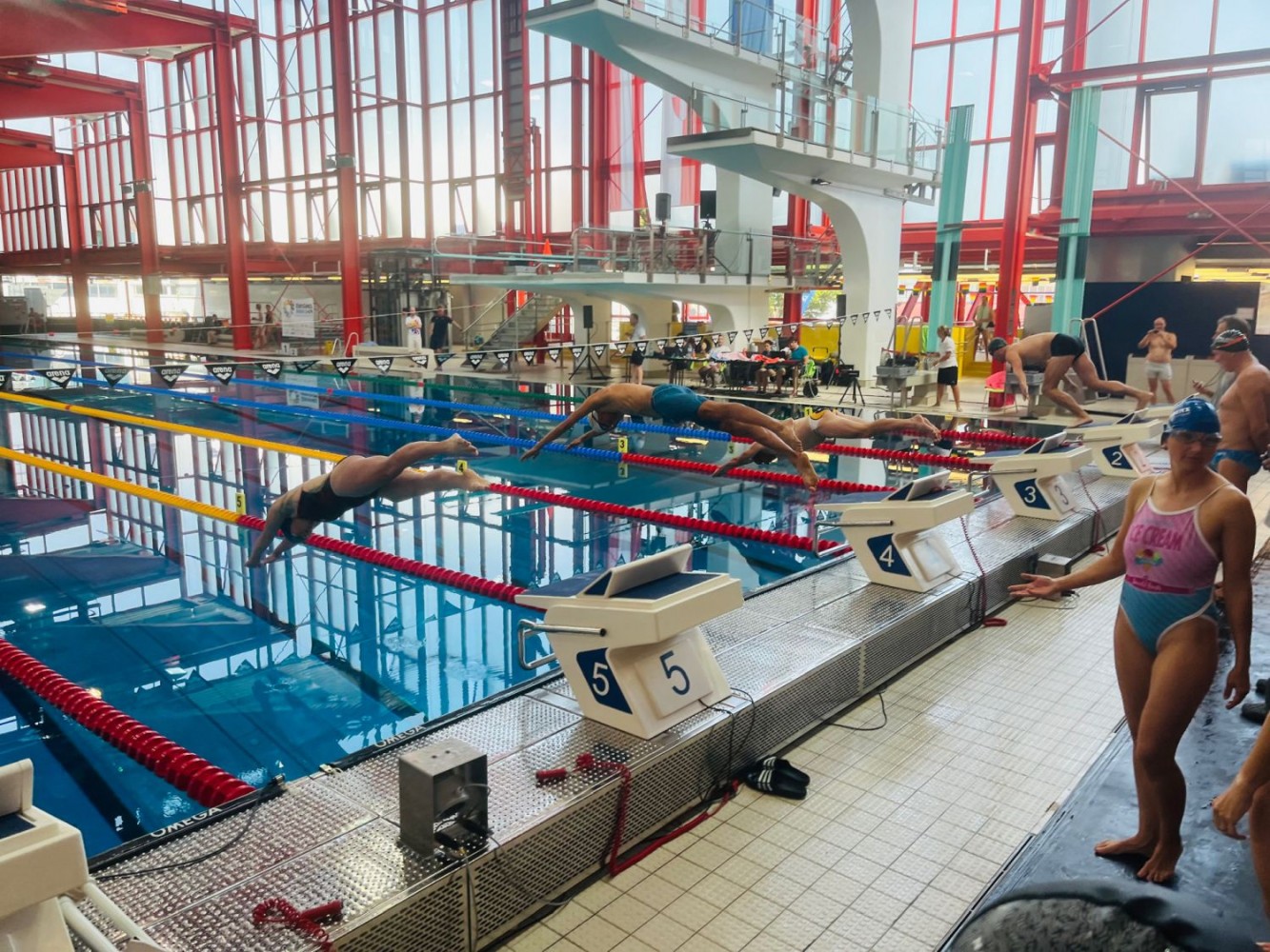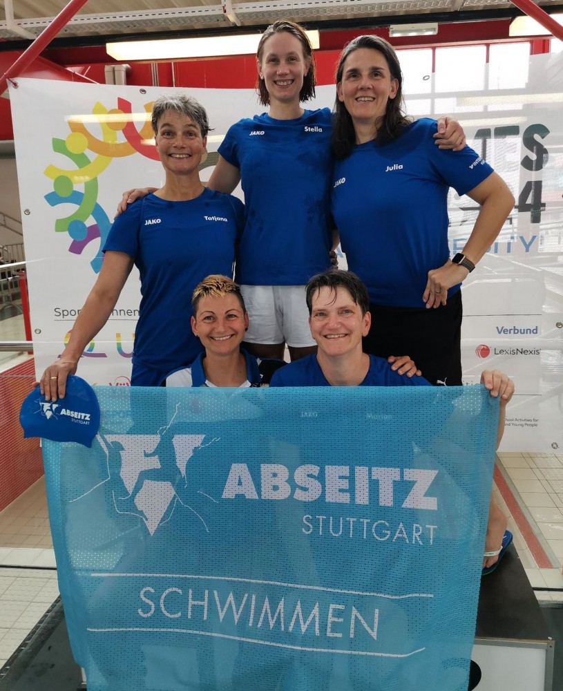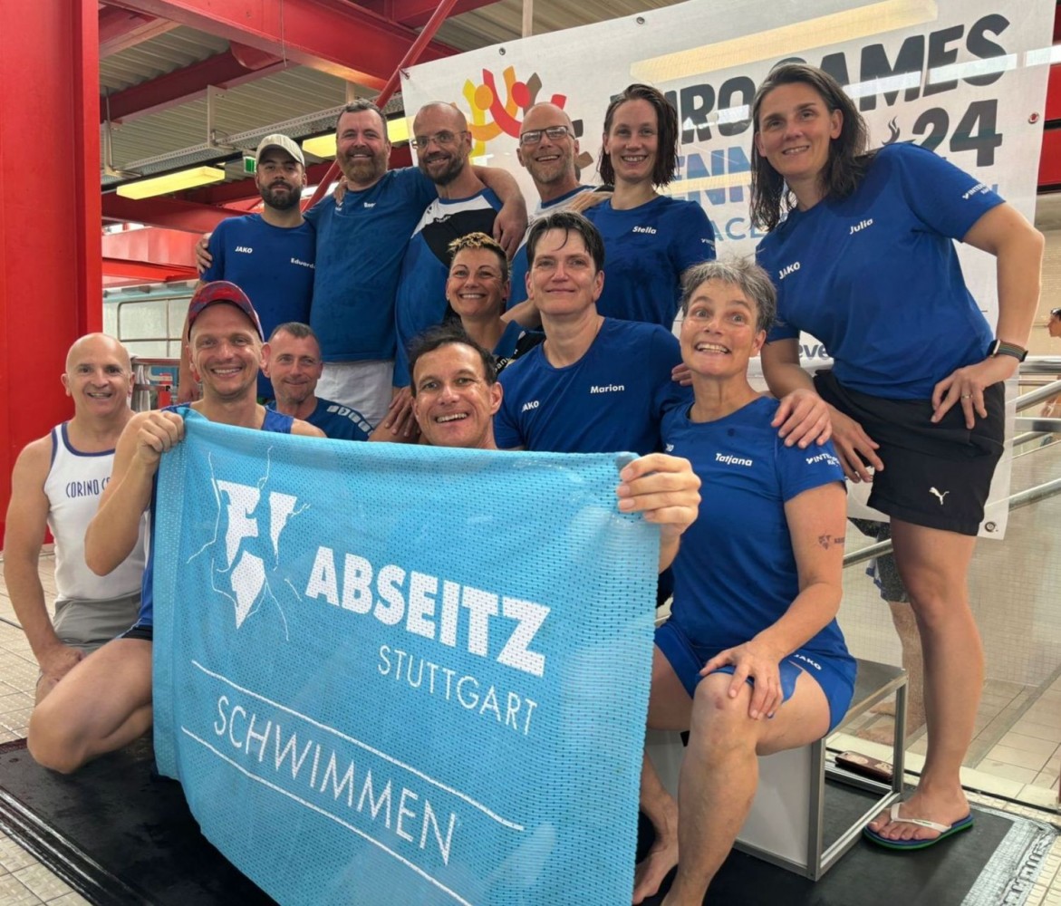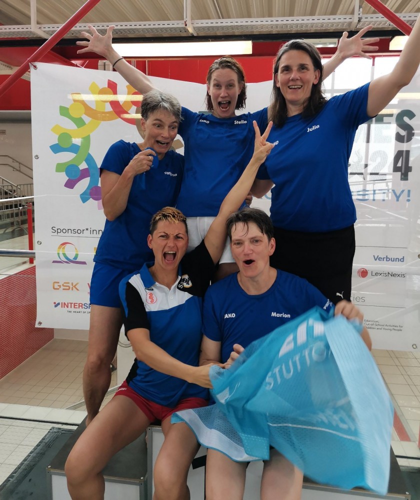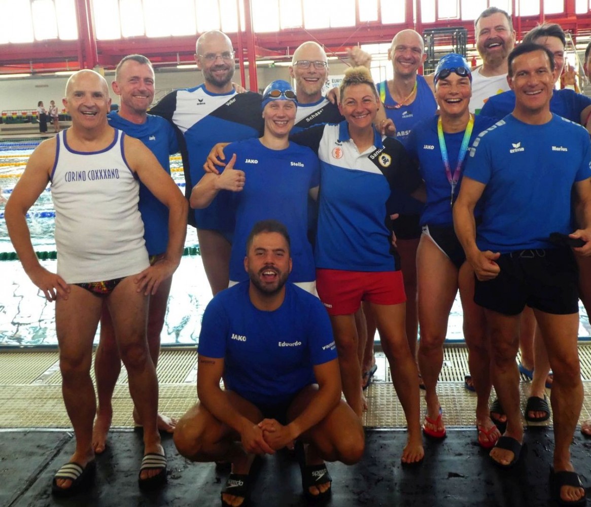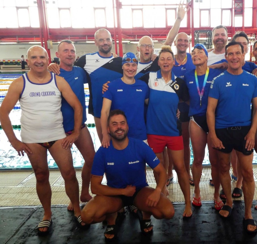 Unsere drei Wettkampfneulinge Oda, Carina und Moritz sind voll dabei und machen ihre Sache richtig gut, tja, bei den Staffeln gibt es eben keinen Anfängerbonus. Thomas hat 18 (ja, achtzehn!) Staffeln für uns ausgeklügelt und seine Berechnungen werden voll aufgehen. Denn beim Abendessen im Restaurant werden wir uns nachher über unsere sieben Gold- und vier Silbermedaillen für die Staffeln freuen. Von den ganzen Medaillen für die Einzelstarts mal ganz zu schweigen. Aber jetzt heißt es erst mal mit Schwächegefühlen das Becken verlassen. Sehr gut, da stehen schon Dagmar und Andreas bereit, die beiden lächeln mich etwas gequält an, haben also auch schon ein hartes Pensum hinter sich gebracht. Und Sandra ist noch im Wasser, sie ist die Vierte in unserem Bund und wird auch gleich noch aus dem Pool rauskommen. Und dann wieder hinten anstellen, aber bitteschön sofort! Es geht schon los, der Schiedsrichter gibt das Zeichen für den Start. Ich habe wenigstens noch die beiden anderen vor mir, also noch eine Minute zum Durchatmen. Diese Minute geht aber echt schnell vorbei, Sandra ist mittlerweile auch schon da, gut zu wissen, dass wir komplett sind. Dagmar hat gerade die 25-Meter-Wende hinter sich und schwimmt nun kraftvoll die Bahn zurück. Ich steige auf den Startblock, nehme meine Position ein und spanne die Muskulatur an. Noch einmal 50 Meter lang ALLES geben…