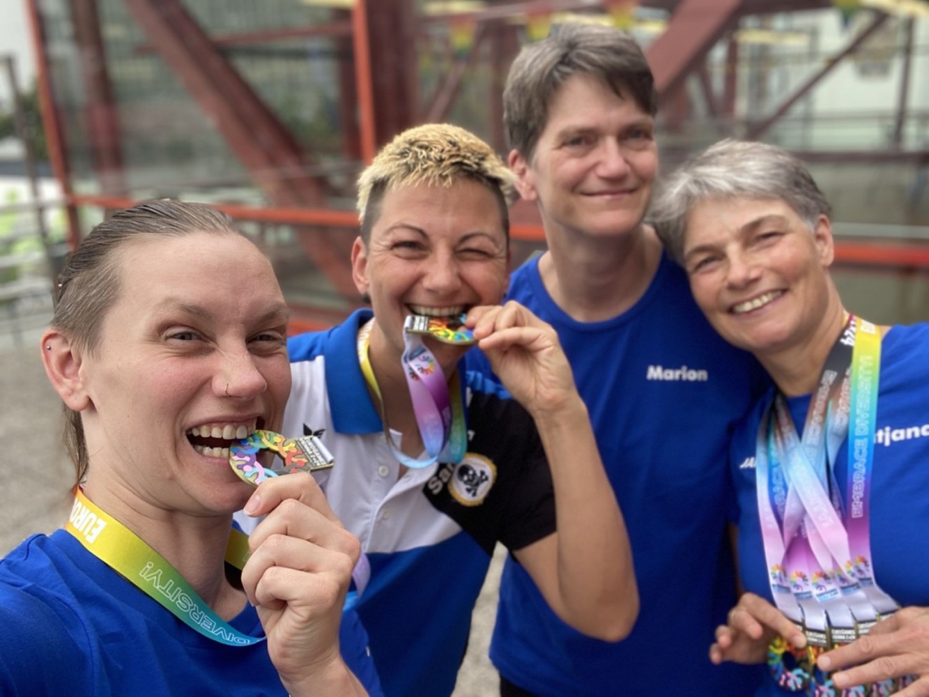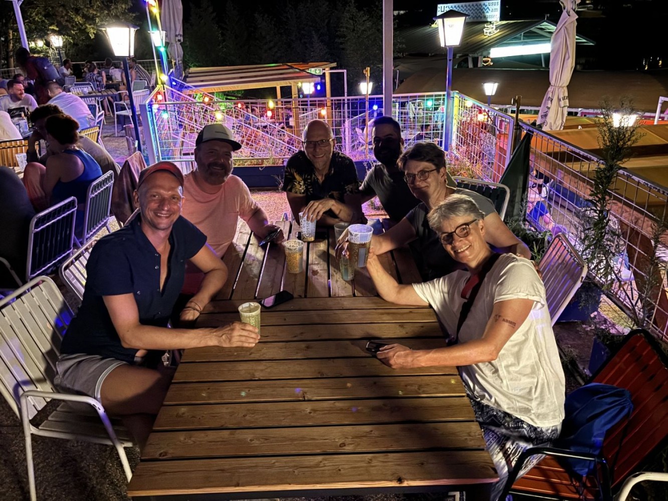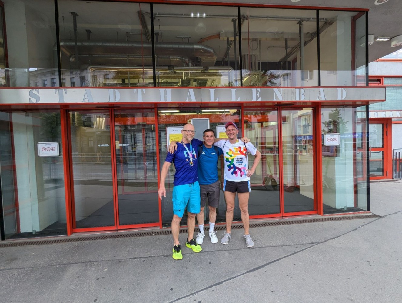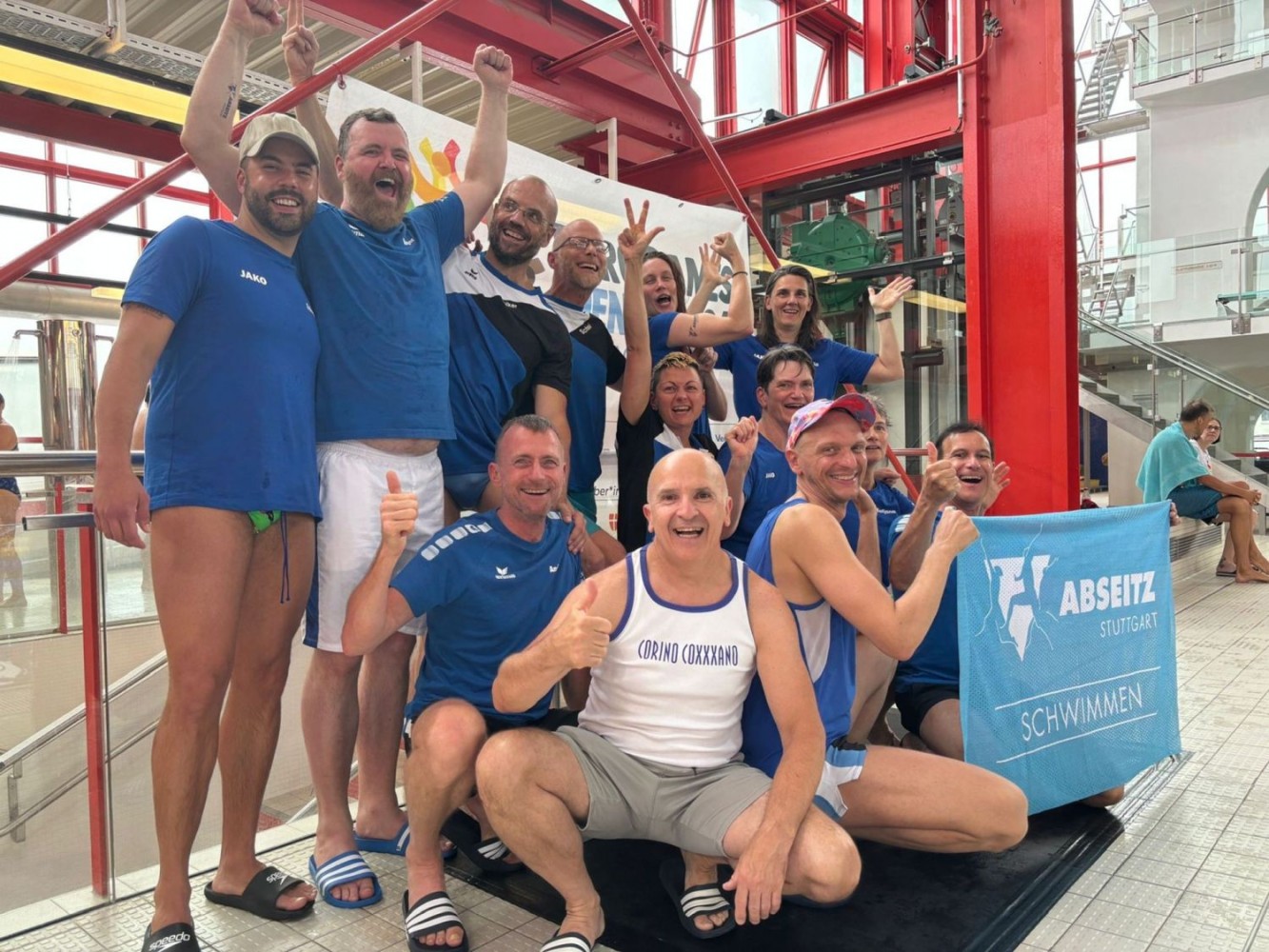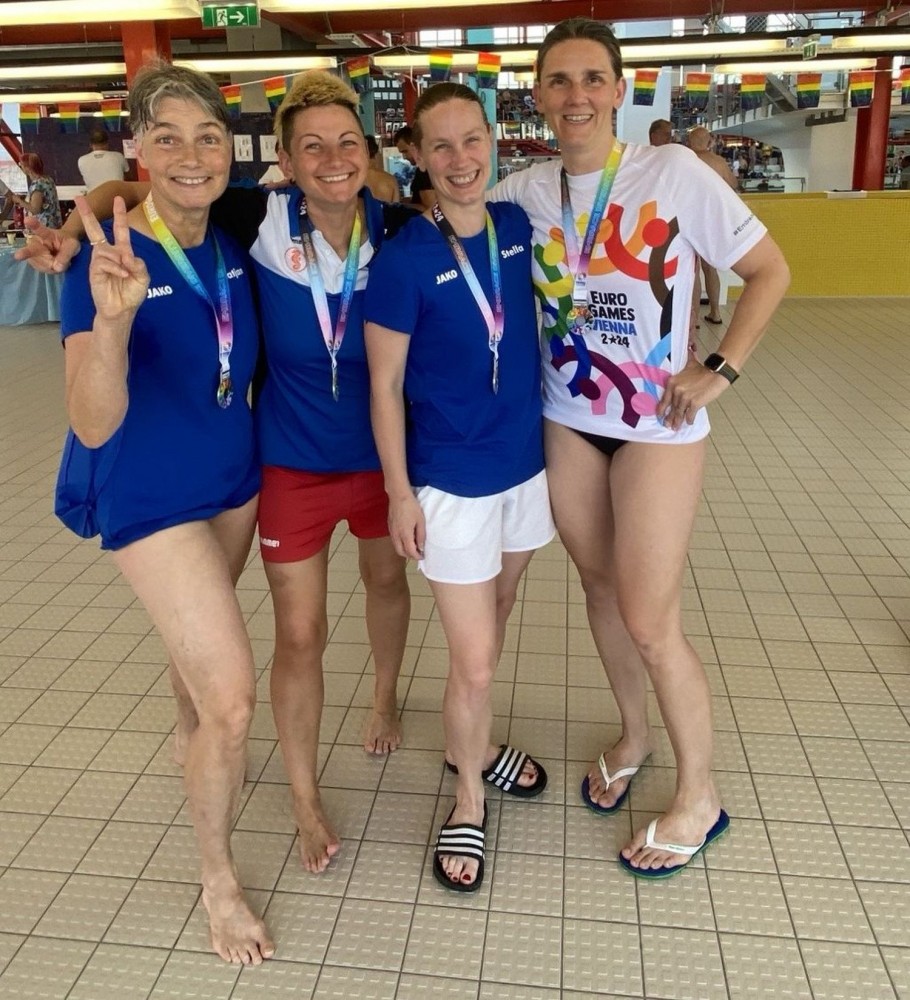 Unsere drei Wettkampfneulinge Oda, Carina und Moritz sind voll dabei und machen ihre Sache richtig gut, tja, bei den Staffeln gibt es eben keinen Anfängerbonus. Thomas hat 18 (ja, achtzehn!) Staffeln für uns ausgeklügelt und seine Berechnungen werden voll aufgehen. Denn beim Abendessen im Restaurant werden wir uns nachher über unsere sieben Gold- und vier Silbermedaillen für die Staffeln freuen. Von den ganzen Medaillen für die Einzelstarts mal ganz zu schweigen. Aber jetzt heißt es erst mal mit Schwächegefühlen das Becken verlassen. Sehr gut, da stehen schon Dagmar und Andreas bereit, die beiden lächeln mich etwas gequält an, haben also auch schon ein hartes Pensum hinter sich gebracht. Und Sandra ist noch im Wasser, sie ist die Vierte in unserem Bund und wird auch gleich noch aus dem Pool rauskommen. Und dann wieder hinten anstellen, aber bitteschön sofort! Es geht schon los, der Schiedsrichter gibt das Zeichen für den Start. Ich habe wenigstens noch die beiden anderen vor mir, also noch eine Minute zum Durchatmen. Diese Minute geht aber echt schnell vorbei, Sandra ist mittlerweile auch schon da, gut zu wissen, dass wir komplett sind. Dagmar hat gerade die 25-Meter-Wende hinter sich und schwimmt nun kraftvoll die Bahn zurück. Ich steige auf den Startblock, nehme meine Position ein und spanne die Muskulatur an. Noch einmal 50 Meter lang ALLES geben…