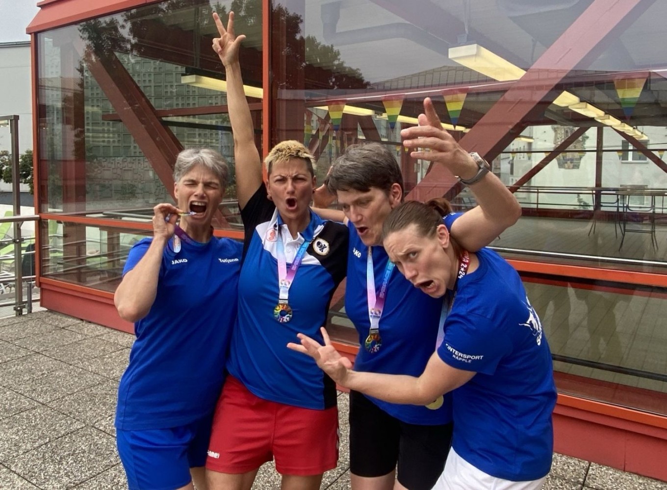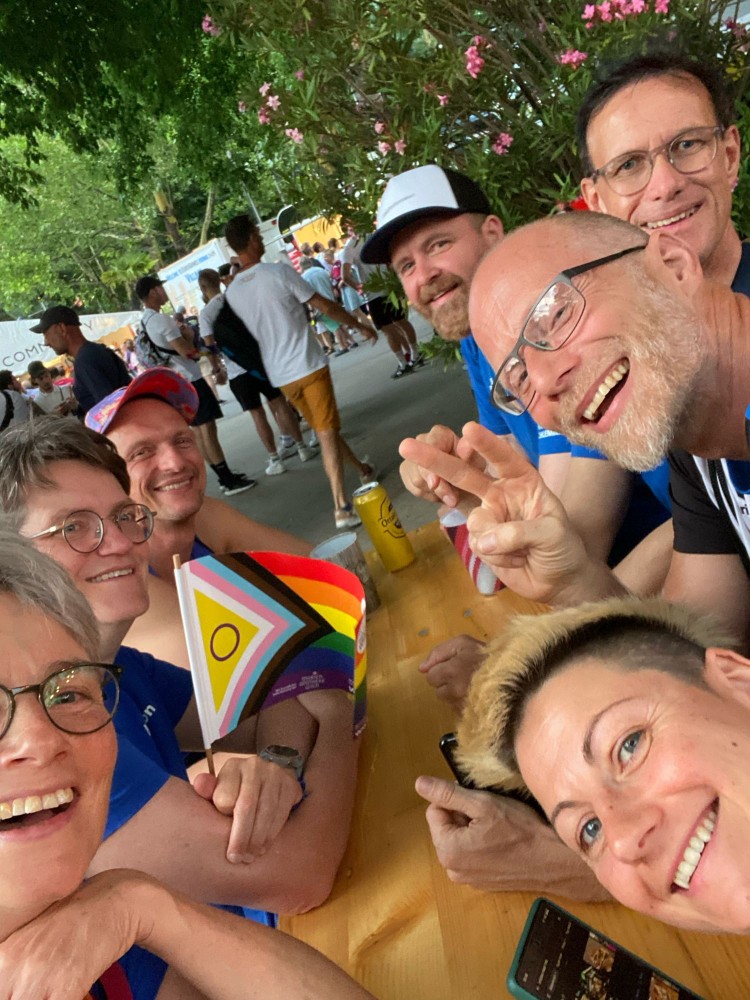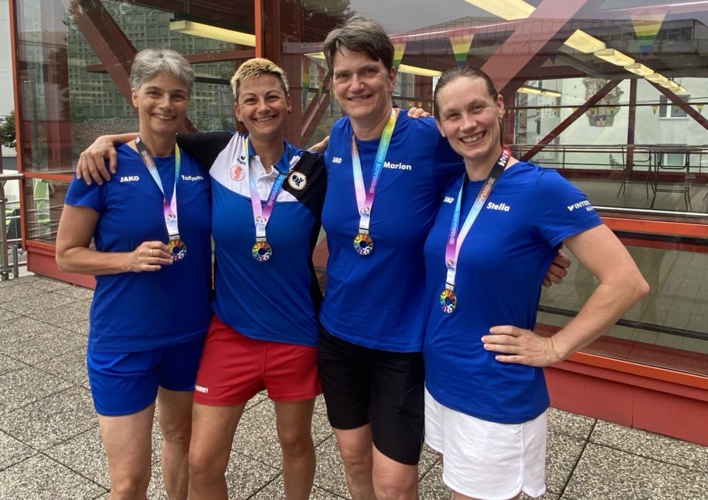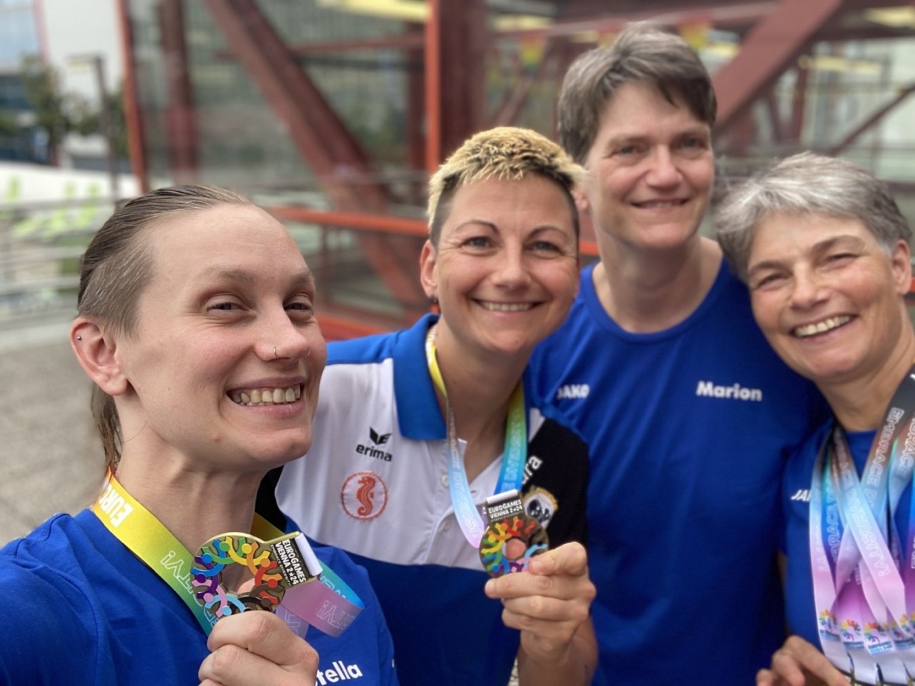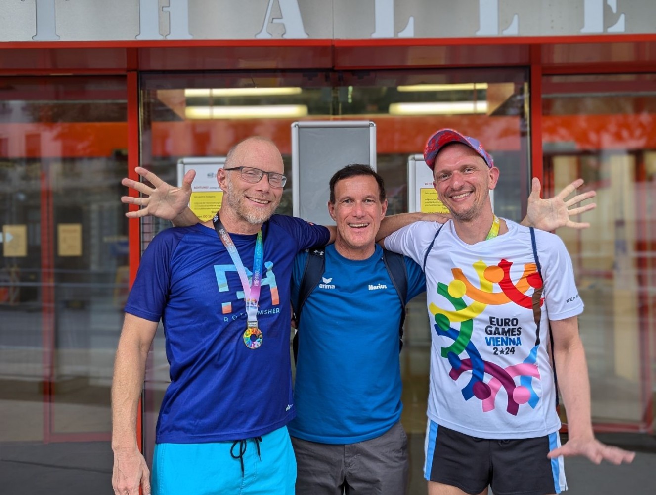 Unsere drei Wettkampfneulinge Oda, Carina und Moritz sind voll dabei und machen ihre Sache richtig gut, tja, bei den Staffeln gibt es eben keinen Anfängerbonus. Thomas hat 18 (ja, achtzehn!) Staffeln für uns ausgeklügelt und seine Berechnungen werden voll aufgehen. Denn beim Abendessen im Restaurant werden wir uns nachher über unsere sieben Gold- und vier Silbermedaillen für die Staffeln freuen. Von den ganzen Medaillen für die Einzelstarts mal ganz zu schweigen. Aber jetzt heißt es erst mal mit Schwächegefühlen das Becken verlassen. Sehr gut, da stehen schon Dagmar und Andreas bereit, die beiden lächeln mich etwas gequält an, haben also auch schon ein hartes Pensum hinter sich gebracht. Und Sandra ist noch im Wasser, sie ist die Vierte in unserem Bund und wird auch gleich noch aus dem Pool rauskommen. Und dann wieder hinten anstellen, aber bitteschön sofort! Es geht schon los, der Schiedsrichter gibt das Zeichen für den Start. Ich habe wenigstens noch die beiden anderen vor mir, also noch eine Minute zum Durchatmen. Diese Minute geht aber echt schnell vorbei, Sandra ist mittlerweile auch schon da, gut zu wissen, dass wir komplett sind. Dagmar hat gerade die 25-Meter-Wende hinter sich und schwimmt nun kraftvoll die Bahn zurück. Ich steige auf den Startblock, nehme meine Position ein und spanne die Muskulatur an. Noch einmal 50 Meter lang ALLES geben…
