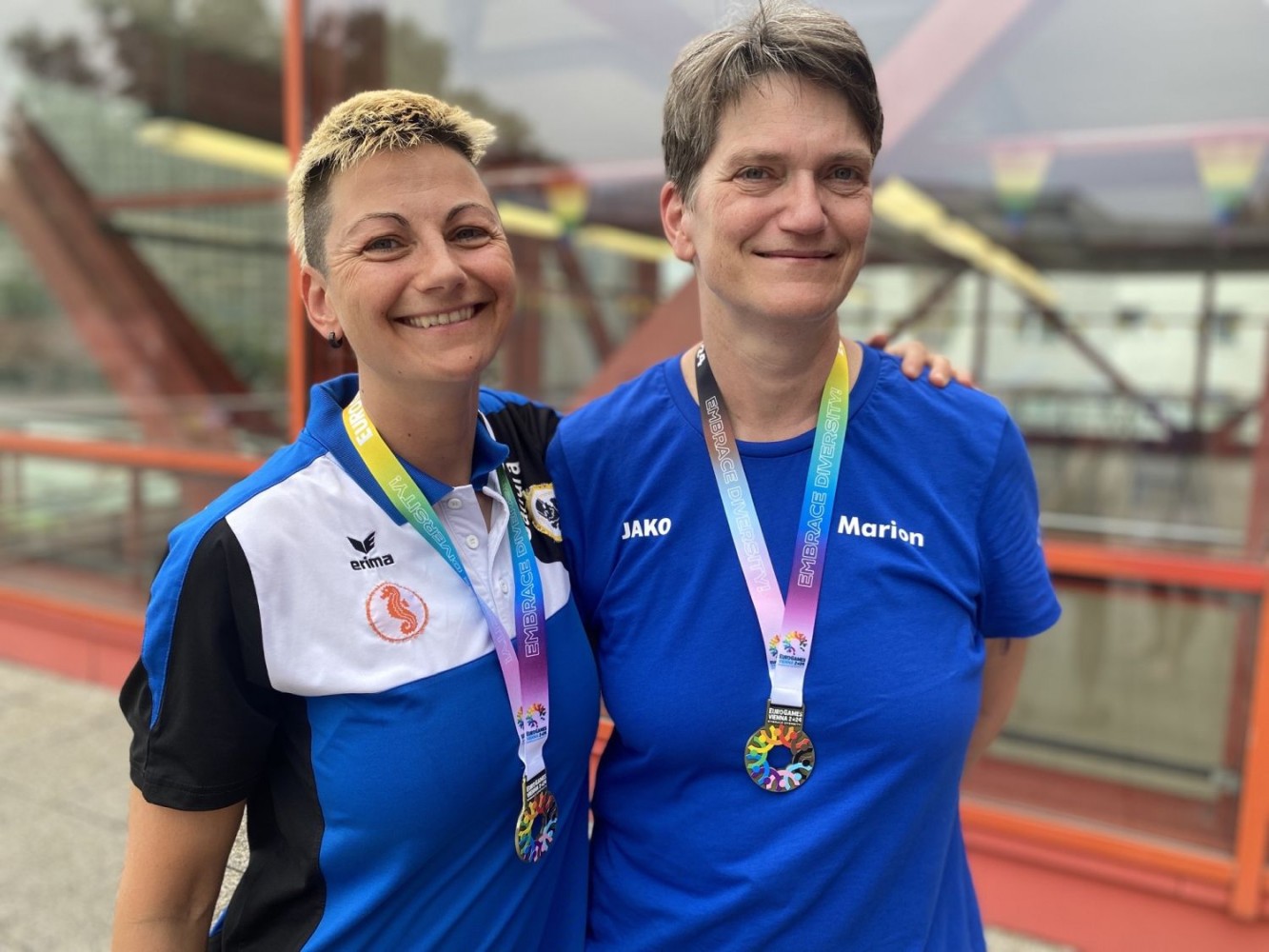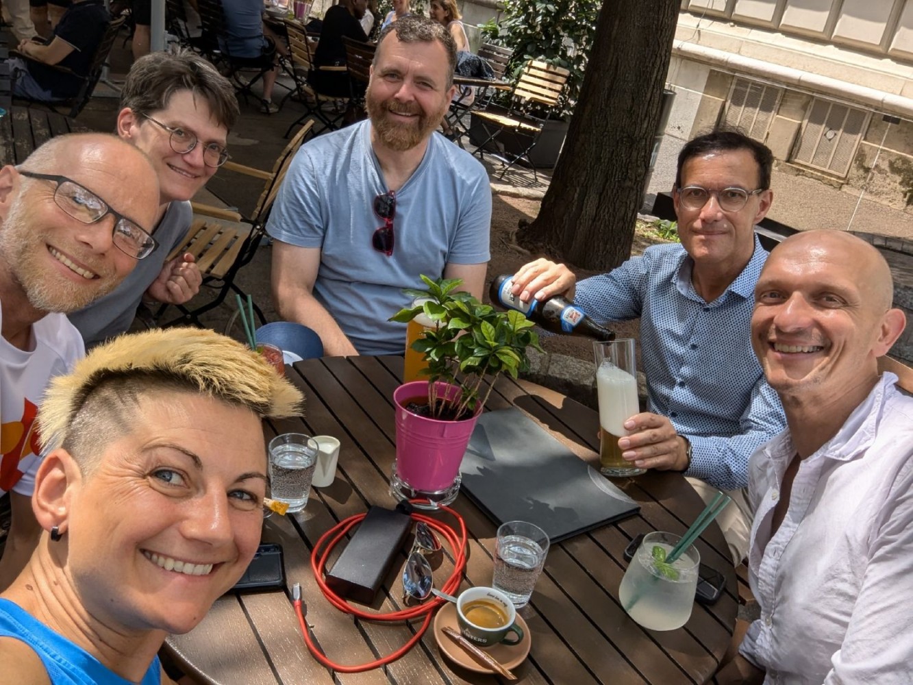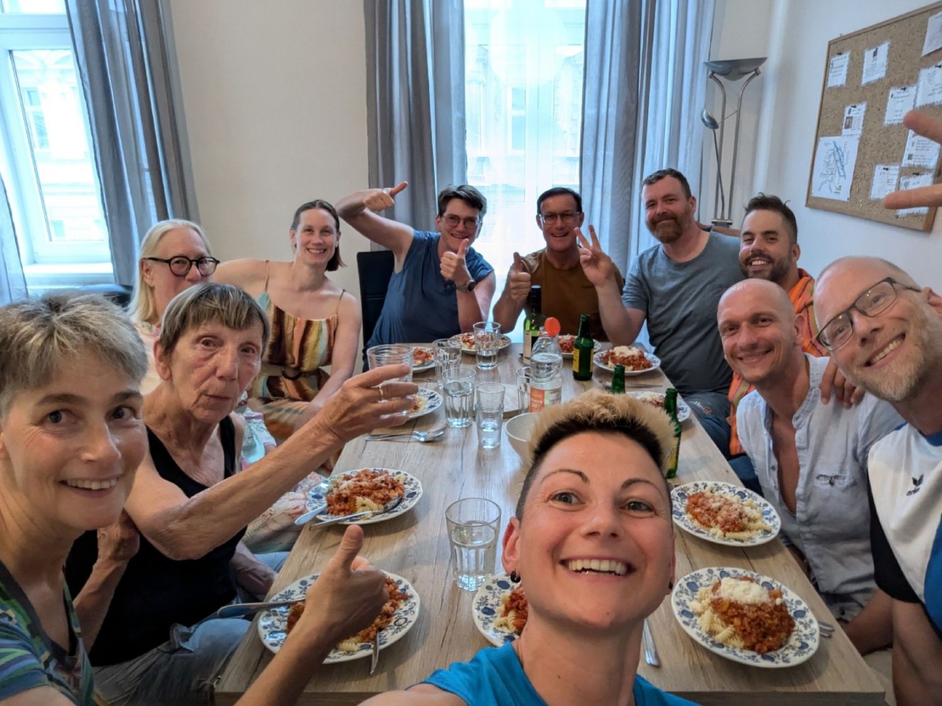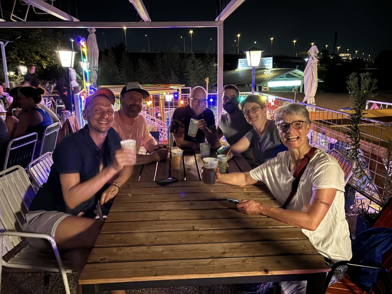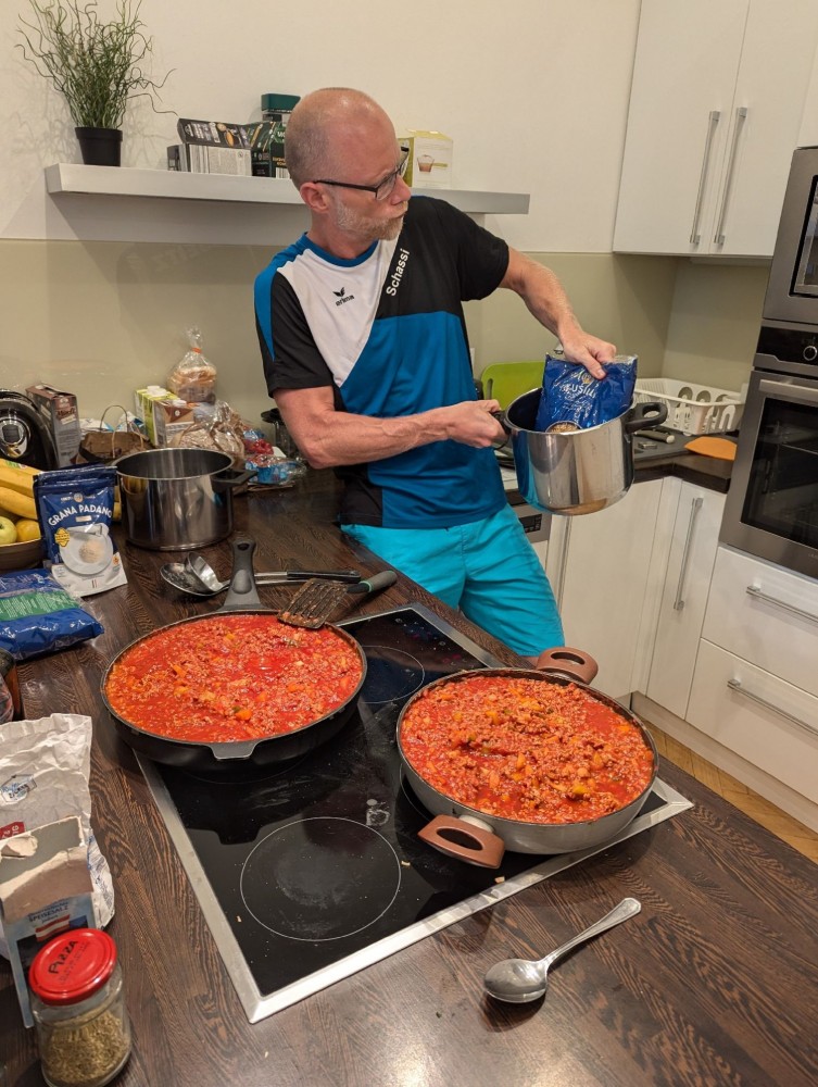 Unsere drei Wettkampfneulinge Oda, Carina und Moritz sind voll dabei und machen ihre Sache richtig gut, tja, bei den Staffeln gibt es eben keinen Anfängerbonus. Thomas hat 18 (ja, achtzehn!) Staffeln für uns ausgeklügelt und seine Berechnungen werden voll aufgehen. Denn beim Abendessen im Restaurant werden wir uns nachher über unsere sieben Gold- und vier Silbermedaillen für die Staffeln freuen. Von den ganzen Medaillen für die Einzelstarts mal ganz zu schweigen. Aber jetzt heißt es erst mal mit Schwächegefühlen das Becken verlassen. Sehr gut, da stehen schon Dagmar und Andreas bereit, die beiden lächeln mich etwas gequält an, haben also auch schon ein hartes Pensum hinter sich gebracht. Und Sandra ist noch im Wasser, sie ist die Vierte in unserem Bund und wird auch gleich noch aus dem Pool rauskommen. Und dann wieder hinten anstellen, aber bitteschön sofort! Es geht schon los, der Schiedsrichter gibt das Zeichen für den Start. Ich habe wenigstens noch die beiden anderen vor mir, also noch eine Minute zum Durchatmen. Diese Minute geht aber echt schnell vorbei, Sandra ist mittlerweile auch schon da, gut zu wissen, dass wir komplett sind. Dagmar hat gerade die 25-Meter-Wende hinter sich und schwimmt nun kraftvoll die Bahn zurück. Ich steige auf den Startblock, nehme meine Position ein und spanne die Muskulatur an. Noch einmal 50 Meter lang ALLES geben…