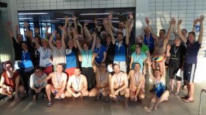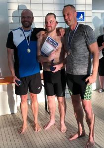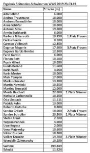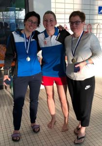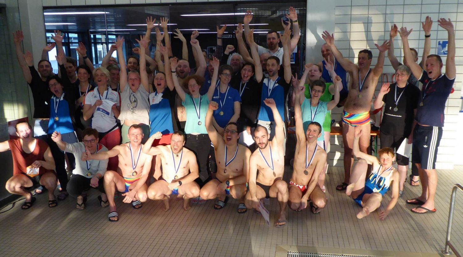 Das schöne, frühlingshafte Wetter am Wochenende des WildWildSouth-Turniers ermöglichte es den 35 Schwimmerinnen und Schwimmern, ihre Pausen auf den Bänken vor dem Schwimmbad zu verbringen. Endlich gab es eine Möglichkeit, frische Luft zu schnappen, nachdem man sich kilometerlang durchs Wasser gepflügt hat. Man wollte auch mal raus aus der Hallenbadhitze und die weiße, gelbe, pinkfarbene, orange oder grüne Nummern-Badekappe abziehen. Dann schnell ein Brötchen, eine Banane oder ein Stück Kuchen essen, ein kurzes Gespräch über Kondition, Kilometer und Krafteinteilung führen und dann wieder rein ins Wasser. Manche Teilnehmerinnen und Teilnehmer sah man sehr selten außerhalb des Beckens, da sie die acht Stunden intensiv zum Schwimmen nutzten. Am Schluss des Turniers wurden die Strecken ausgewertet und schnell wurde eines klar: der bisherige Frauen-Rekord aus dem Jahr 2017 wurde gleich von allen drei diesjährigen Siegerinnen gebrochen. Dagmar kam auf den dritten Platz, Sandra erreichte den zweiten und mit knapp 20 Kilometern sicherte sich Barbara den ersten Platz. Aber auch die Männer glänzten, Volker aus Stuttgart wurde Dritter, Sandro aus Basel Zweiter und Moritz aus Nürnberg hat sich mit 22 Kilometern auf den ersten Platz geschwommen.