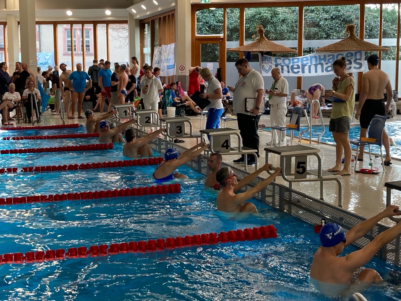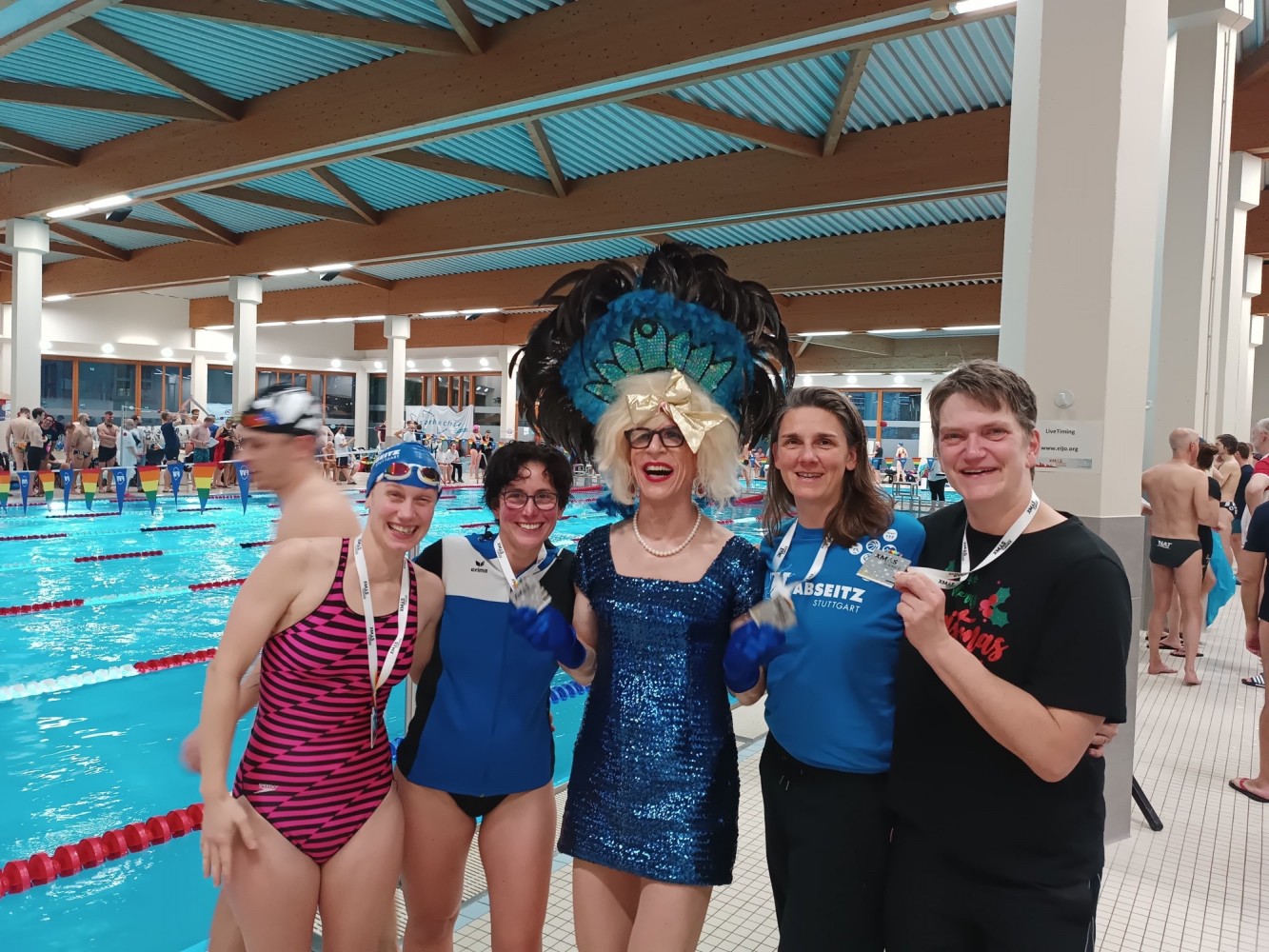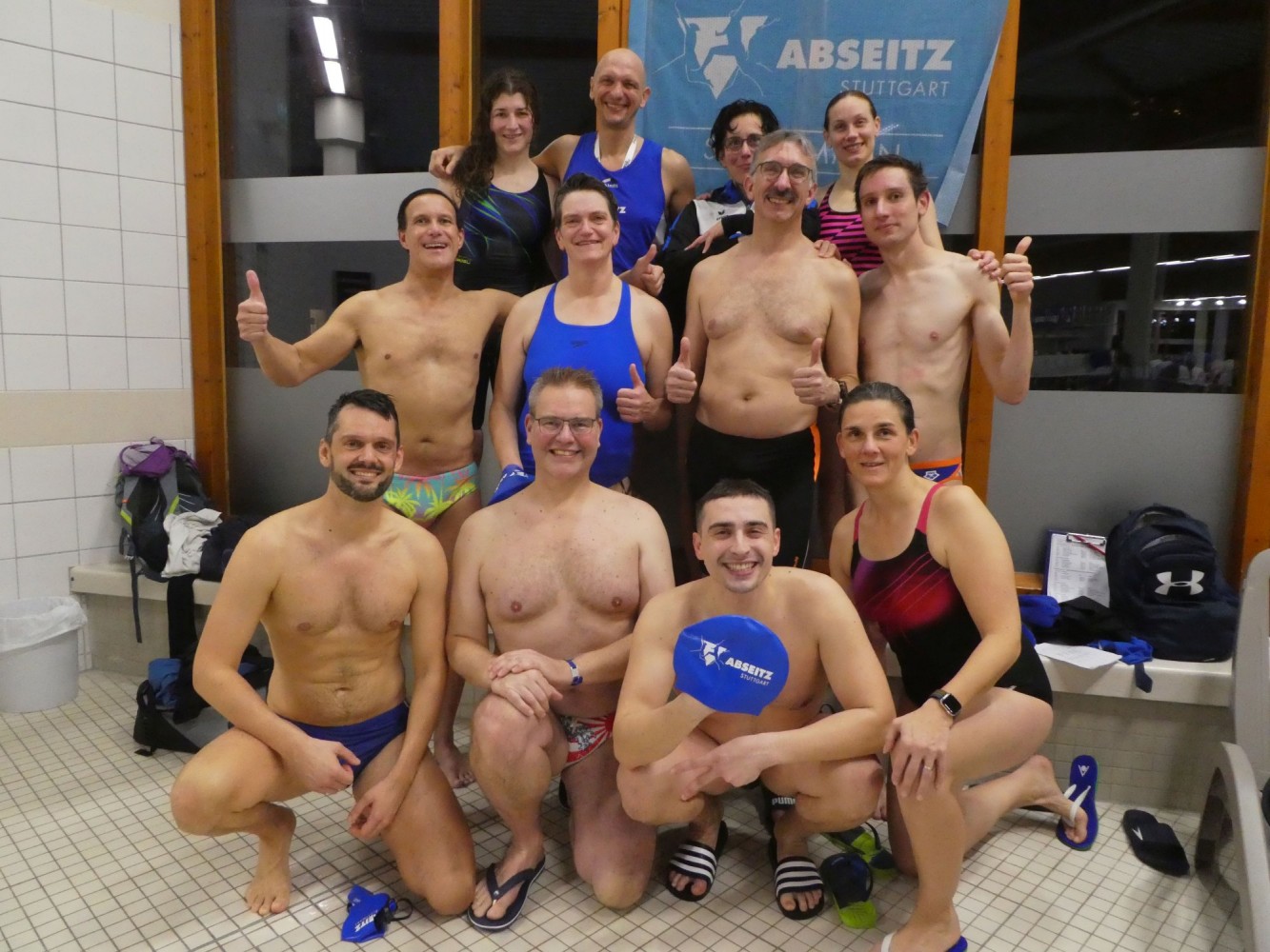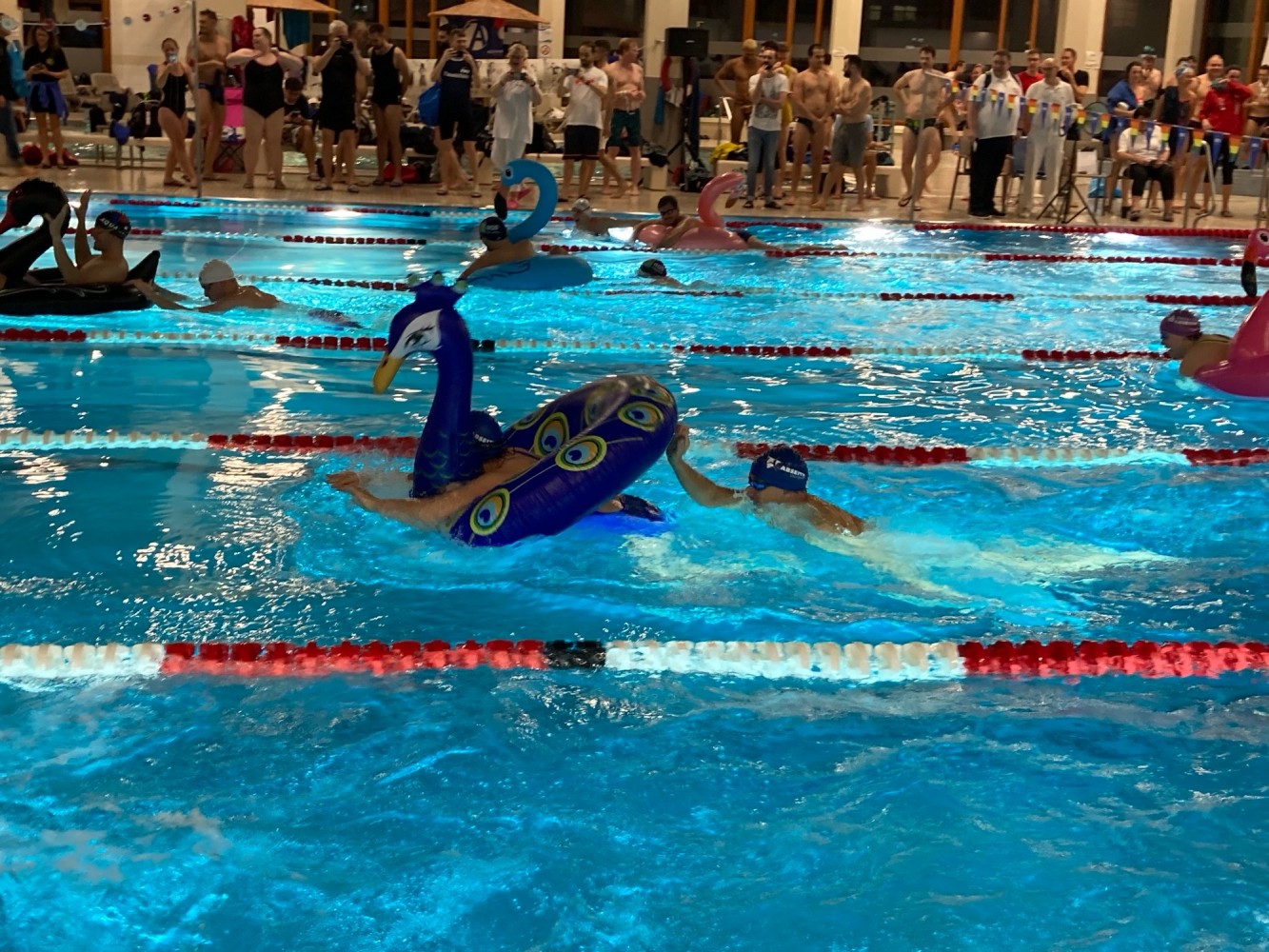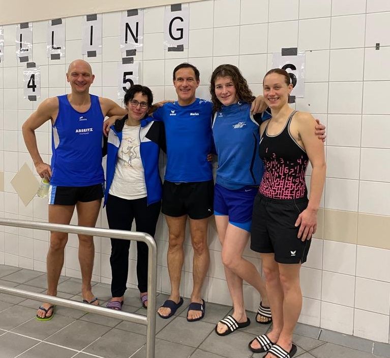 Staffeln? Die Frauen waren dieses Jahr überdurchschnittlich stark vertreten und damit konnten wir zwei reine Frauen-Staffeln schwimmen, eine in Brust, eine in Freistil, beide erfolgreich. Die Jungs haben unter den gesundheitlichen Ausfällen mehr gelitten, doch konnten auch sie trotz des schwimmerischen Fachkräftemangels auf ganzer Linie überzeugen. Julia, Stella, Andreas und Valerio haben zum ersten Mal unser Abseitz-Team verstärkt. Die vier haben dank Marions Trainingseinheiten gleich mal alles gegeben und sind kraftvoll durch die Hoechster Fluten gepflügt.
