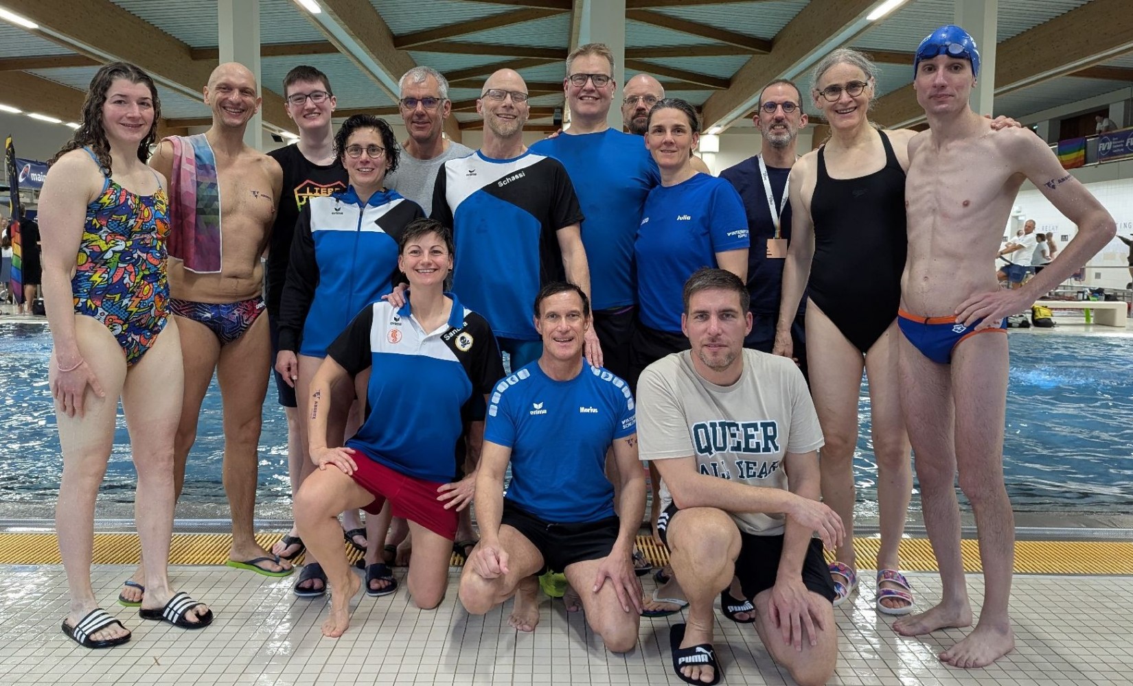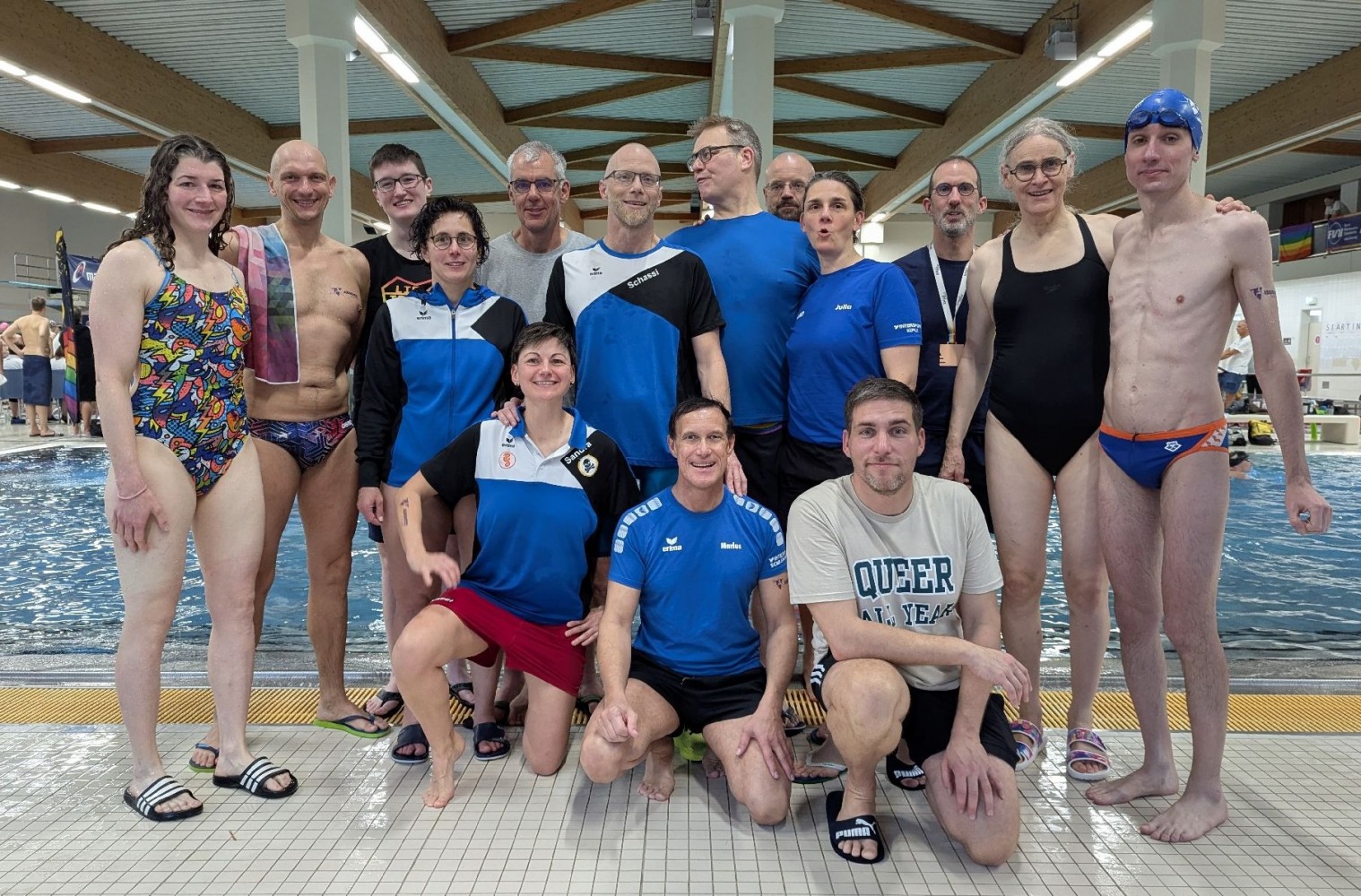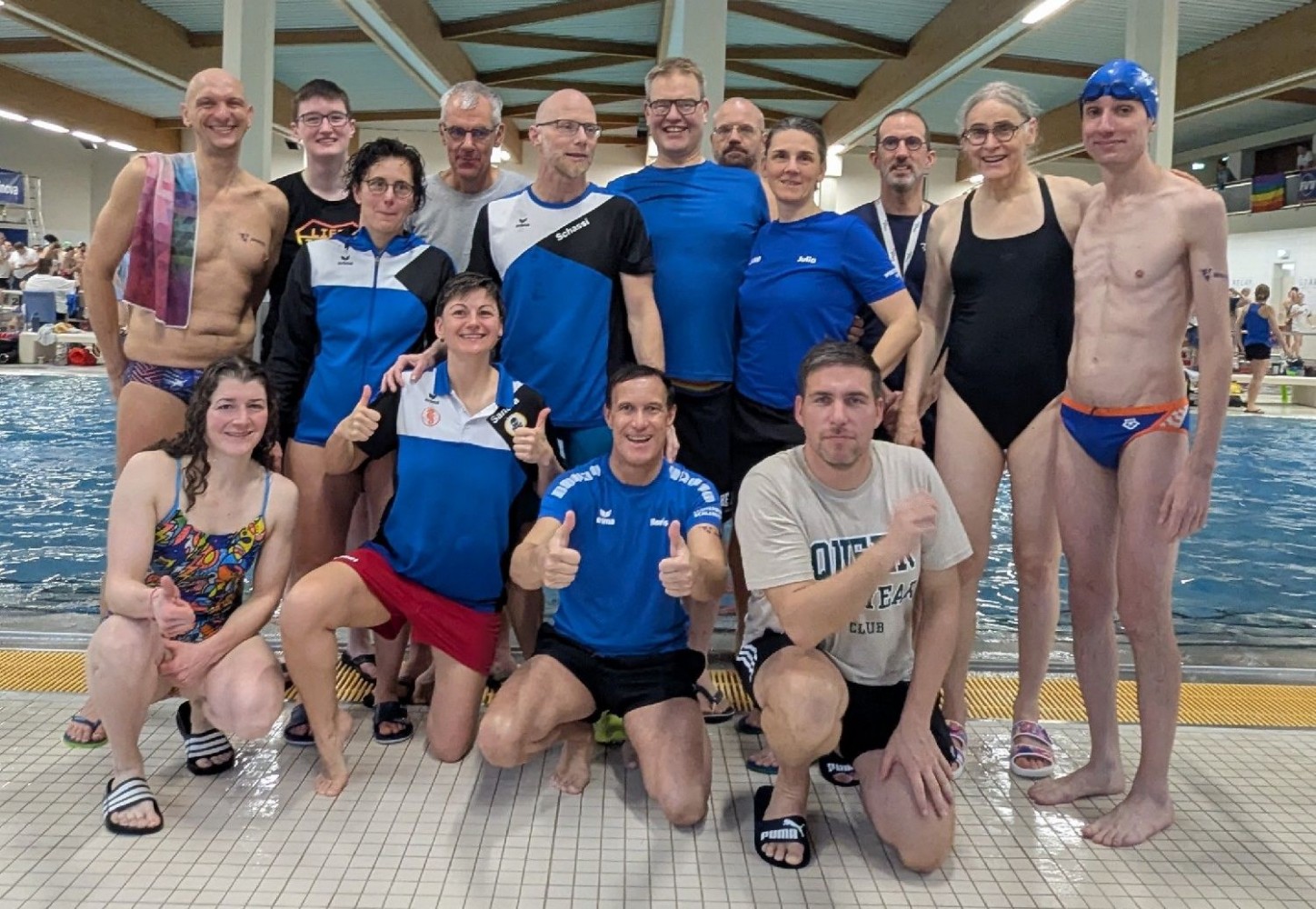 Doch wir können die kurze Fahrtzeit nicht unbekümmert genießen. Am Vorabend hatten wir uns beim gemeinsamen Essen im Green Thai in der Frankfurter Innenstadt noch gefreut, dass wir dieses Jahr zum ersten Mal keine krankheitsbedingten Ausfälle haben. Am Samstag hatte sich die Lage leider schon verändert, und so mussten wir in der S-Bahn noch schnell unsere Staffelplanung anpassen. Dies war nicht übermäßig schwierig, denn wir konnten aus dem Vollen schöpfen: mit sechs Schwimmerinnen und acht Schwimmern waren wir in der Lage, nahezu alle Frauen- Männer- und Mixed-Staffeln für Lagen, Freistil und Brust prominent zu besetzen.