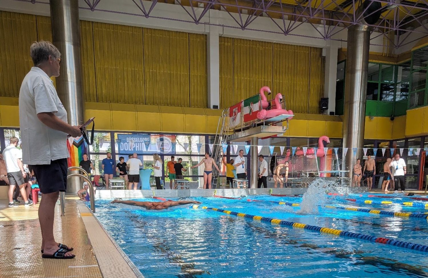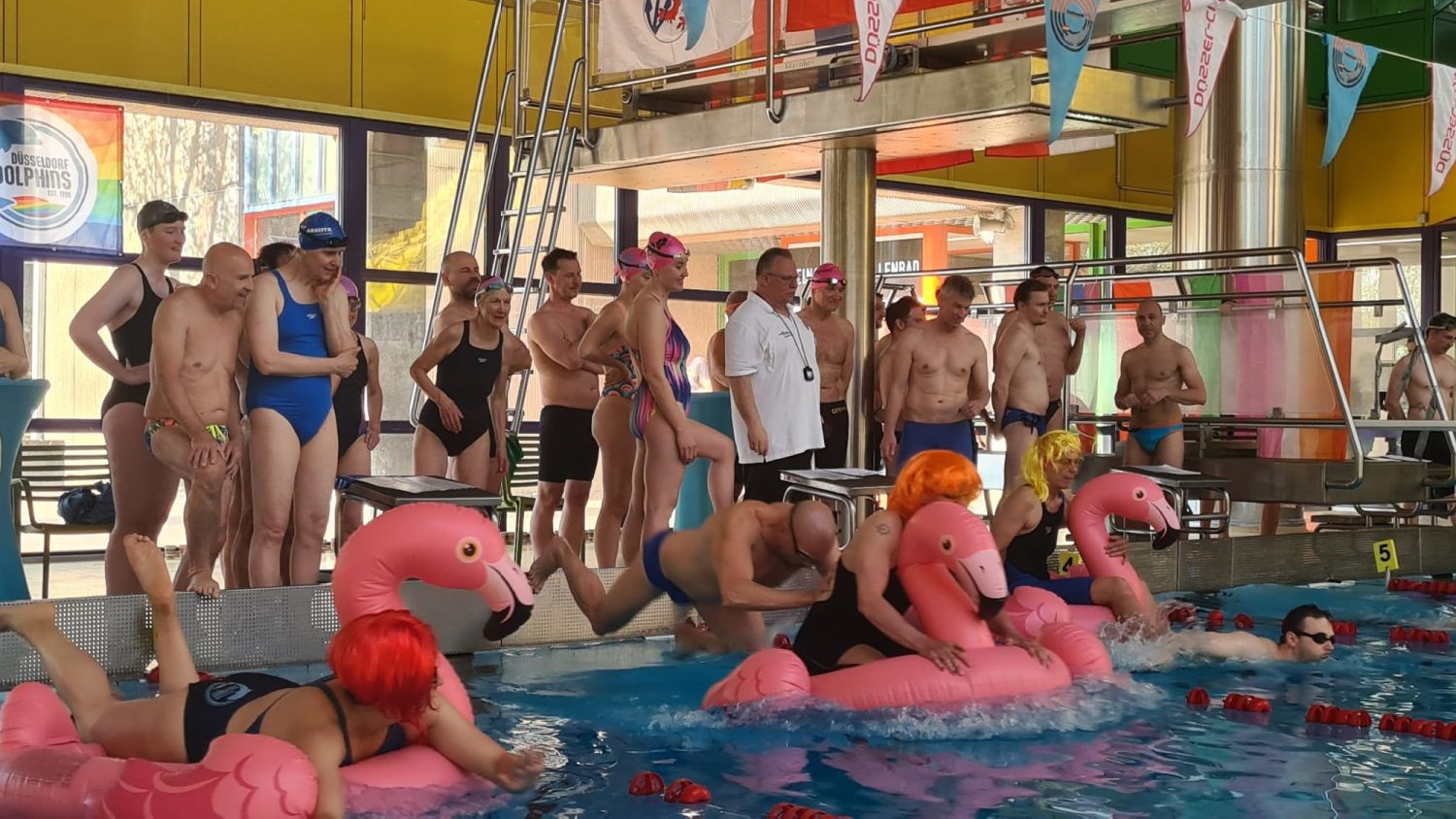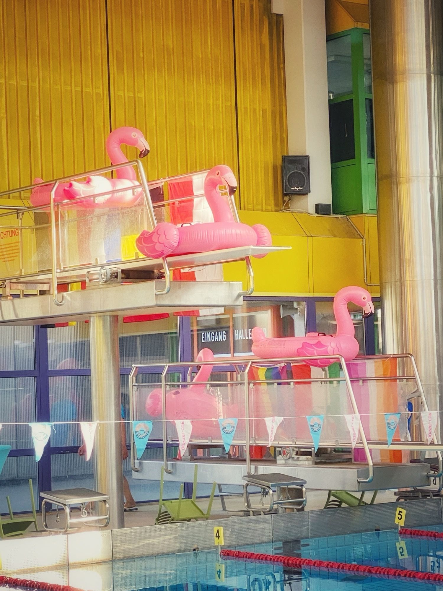 Sie waren weder farblich noch von der Größe her zu übersehen: bereits beim Betreten der Schwimmhalle des Hallenbads Düsseldorf-Eller fielen sie ins Auge, die fünf pinkfarbenen, aufblasbaren Flamingos, eingezwängt in die engen Geländer der Ein- und Drei-Meter-Sprungtürme. Es war nicht viel Spekulation nötig, um auf den Verwendungszweck der bunten Tiere zu kommen: es musste sich um das Equipment für die Fun-Staffel handeln.
