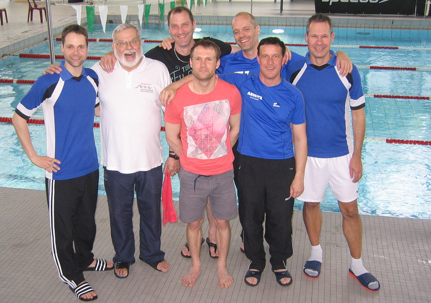 Da der Mai-Feiertag dieses Jahr auf einen Donnerstag fiel, tauchten viele Schwimmerinnen und Schwimmer lieber in ein langes Wochenende anstatt ins Chlorwasser ein. Nur so ist es zu erklären, dass das Internationale Masters-Schwimmfest der Sportvereinigung Feuerbach dieses Mal recht wenige Teilnehmer hatte. Dafür war der wie immer gut organisierte Wettkampf im Hallenbad Feuerbach noch etwas familiärer als sonst. Wir stellten mit unseren sechs Schwimmern und einem Wettkampfrichter sogar eine der größeren Turniermannschaften. Neben vielen Einzelstarts haben wir auch bei den Staffeln kräftig mitgemischt und konnten uns in der Lagen- und Freistil-Staffel gut positionieren. Nur bei der abschließenden „Bier-Staffel“ überzeugten wir nicht so recht: schwimmerisch konnten wir gut mithalten, aber wir gehörten nicht gerade zu den schnellsten Biertrinkern. Spaß hat es trotzdem gemacht und den echten Biergenuss haben wir uns dann anschließend in einem Feuerbacher Brauhaus gegönnt.