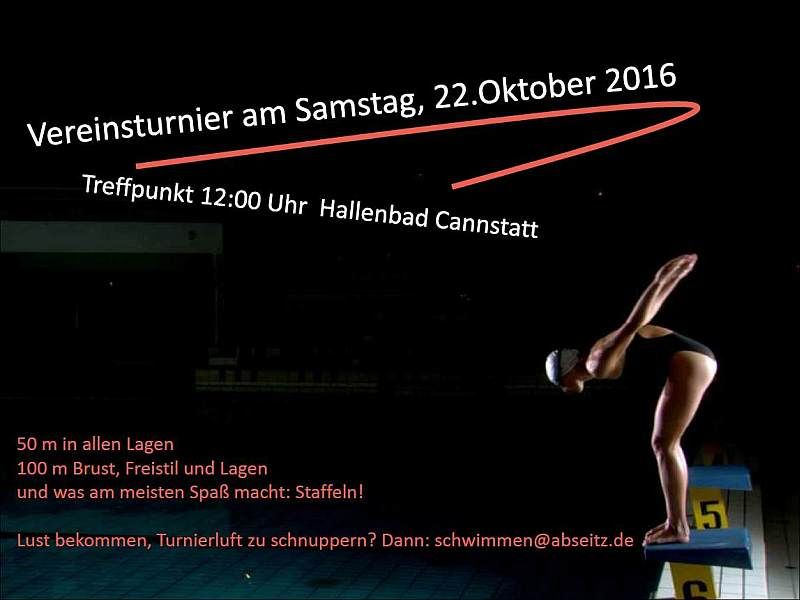 Knapp 20 Schwimmerinnen und Schwimmer haben sich am Samstagmittag am Eingang des Hallenbads Cannstatt eingefunden. Nach ein paar kurzen Einwärmübungen am Beckenrand ging es dann mit dem eigentlichen Programm los, neben 50 m in allen Lagen gab es noch 100 m in Brust, Freistil und Lagen. Spaß hat's allen gemacht, auch wenn es bei den Startsprüngen manchmal hakte. Und einige verborgene Talente sind auch dieses Mal wieder zum Vorschein gekommen. Zum Abschluss des Turniers gab es dann noch eine 4 x 50 m-Staffel.